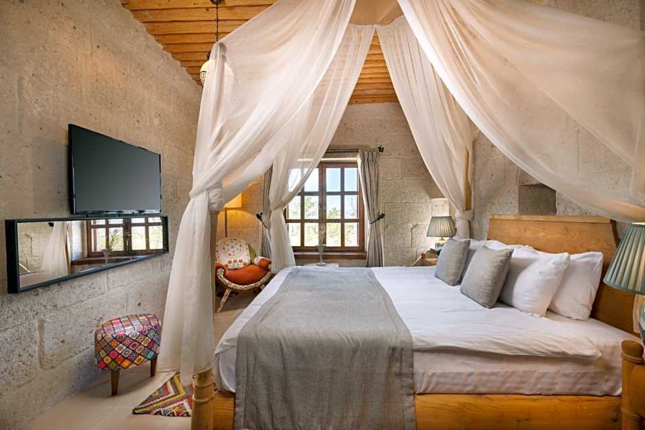 Konaklamalar, mağara esintili sığınaklardan şık süitlere kadar eğlenceli bir yelpazede sunulur ve farklı ruh hallerine ile gezi programlarına hitap eder. Cave Vasil, queen-size yataklı rahat bir çift kişilik düzeni sağlarken, Cave Tandirevi çift kişilik yataklı başka bir mağara tarzı seçenek sunar. Aileler ve gruplar için Family Suite (Castle View) dört yetişkini ağırlayabilir; Rupestral Grand Suite ise şık bir iki kişilik kaçamak sunar. Deluxe, Twin ve Premium süitler gibi çeşitli Deluxe ve Premium konfigürasyonları, daha fazla alan ve farklı düzenler arayan konuklar için kadroyu tamamlar.